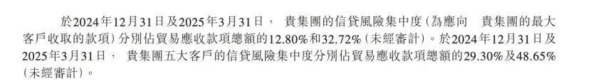 与此同时,信贷风险集中度也在同步上升。根据招股书,2025年3月31日,公司应向最大客户收取的款项占贸易应收款项总额的32.72%,较2024年12月31日的12.80%大幅上升。