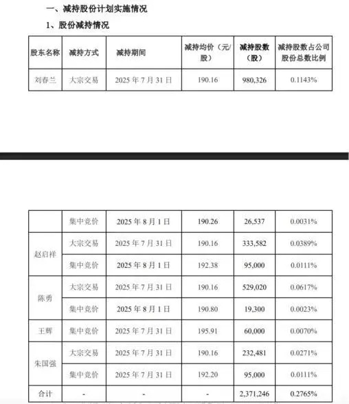 8月4日,胜宏科技发布公告显示,董事刘春兰(陈涛妻子)、董事兼总裁赵启祥、董事兼副总裁陈勇(陈涛弟弟)、执行副总裁王辉、财务总监朱国强5人完成减持计划,合计减持237万股,以减持均价计算,总套现金额约4.5亿元。