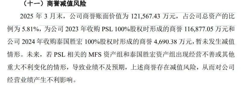 此外,公司还存在商誉减值风险。根据其公告,2025年3月末,公司商誉账面价值为12.2亿元,占公司总资产的比例为5.81%,为公司2023年收购PSL100%股权时形成的商誉11.7亿元和公司2024年收购泰国胜宏100%股权时形成的商誉4690万元。